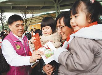 臺北市長郝龍斌昨天下午現身花博園區,發送1000份春聯及紅包袋給游客。圖片來源:臺灣《聯合報》
