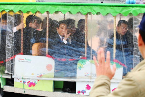 大陸海峽兩岸關(guān)系協(xié)會會長陳云林(后中)夫婦22日搭乘游園專車參觀臺北花博大佳園區(qū),陳云林隔著透明塑膠布,與熱情游客互相揮手致意。 圖片來源:“中央社”
