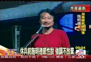 據報道,在臺“倒扁”總部決定暫時休兵后,施明德13日晚來到臺北火車站前向在這里靜坐的“倒扁”民眾信心喊話。他一上臺就先表明,他不是要來跟大家道別的,因為人民反貪的力量永遠不會退卻;他也特別感謝從9月9日“倒扁”活動開始以來就一直參與到現在的民眾,并稱贊這1個月的活動已經是世界民主運動的最佳教材。