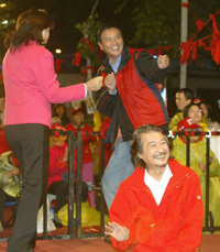 臺灣“紅衫軍”今天將移師到位于臺北市重慶南路一段的“紅衫軍之家”,昨晚是在臺北火車站靜坐的最后一夜,現場辦起了“施主席的轟趴(home party)”,有著嘉年華的氣氛,臺“倒扁總部”副總指揮馮定國(后右)與聲樂家呂麗莉(后左)還大跳扭扭舞,逗得施明德(前)開懷大笑。(圖片來源:臺灣聯合新聞網)