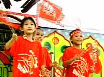 昨天臺中市的“倒扁”集會現場還迎來了一群天真活潑的小女生前來。她們穿著一致的“倒扁”紅衫,頭綁“倒扁”紅標語,揮舞著“倒扁”小旗,在臺上大跳“倒扁舞”,非常有默契,口號也喊得特別響亮。