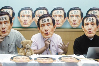花蓮青年戴馬英九面具反黑金。圖片來源:聯合報