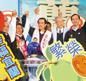 馬英九(中)、吳敦義(右二)、朱立倫(右一)、王金平(左一)等國民黨天王,昨晚齊聚宜蘭縣長呂國華(左二)幸福宜蘭之夜。(來源:臺灣《聯(lián)合報》)