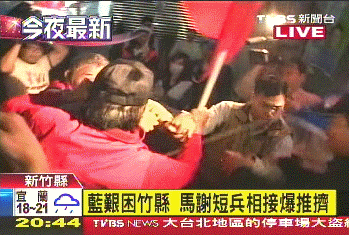 據臺灣TVBS電視臺報道,馬英九、謝長廷,各自帶著候選人掃街,沒想到半路上,狹路相逢,爆發沖突。綠營支持者不滿員警為了元首維安,在馬路上拿盾牌筑人墻,不讓拜票隊伍經過,情緒爆發。他們對著馬英九高喊:“為什么不能過去?為什么不能過?”混亂中還有人動手拉扯候選人旗幟,場面更加混亂。
