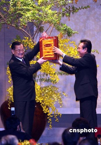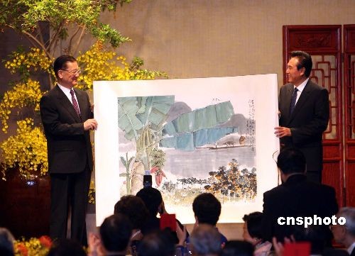 連戰(zhàn)依照習俗向陳云林[右]送上名產作為手禮,并送贈一幅表現臺灣鄉(xiāng)村風貌的書畫。