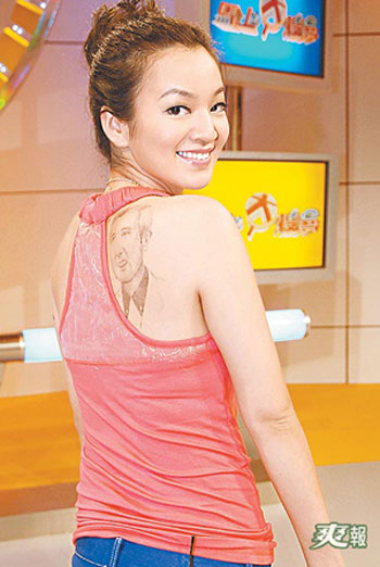 不過,右肩有圖、左肩卻顯得空空的,這時,另一個主持人Ruby突發奇想說:“右邊有‘馬總統’,左邊再畫個馬夫人,來個軟骨功,把左右臉邊的肩胛骨合起來,就可以讓‘馬總統’與馬夫人玩親親了。”