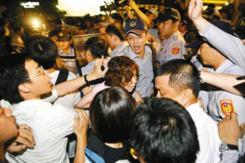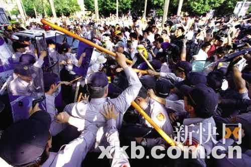 昨天上午,陳馬會突然宣布提早舉行,打了民進黨一個措手不及,此時各路綠營人馬都還在路上,原定下午1時進行的“嗆馬圍陳”行動也失去了目標。但綠營不肯放棄這個蓄謀已久的計劃,抓住最后一個出風頭的機會不放,在陳馬會已告結束的情況下,繼續聚集在臺北賓館外,與警方爆發激烈的流血沖突,數名警員與記者在沖撞中受傷送醫。