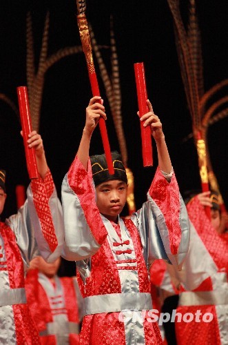 3月19日,“世界的孔子:孔廟與祀典國際學術研討會開幕式暨佾舞交流展演”在臺北市府舉行,由此拉開臺灣春季祭祀孔子的盛大序幕。圖為臺灣小學生在表演祭祀孔子舞蹈。中新社發 閆曉虹 攝