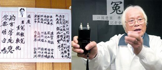 15年前在空戰部服役的上兵江國慶,被控奸殺謝姓女童遭槍決后,他的父親江支安(已故,右圖)在自宅大門張貼誣害江國慶的“狗官”名單(左),提醒自己為兒子洗清冤情。(《聯合報》資料照片)
