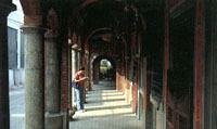 沿老街南行,可抵開蘭第一古廟——慶元宮。慶元宮建于嘉慶元年,為大規模移民入住宜蘭時建立的第一座廟,奉祀著庇佑移民的媽祖。若以慶元宮為界,老街南段為當年小商家的所在,因此屋舍較為密集,雖不象北段那樣寬闊,卻更有老街的獨特韻味,成排的紅磚店屋前圓拱連綿,女兒墻上仍刻著昔日商號。