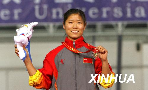 2月24日,中國選手董飛飛在頒獎儀式上展示金牌。當日,在第24屆世界大學生冬季運動會速度滑冰女子5000米決賽中,董飛飛以7分19秒76的成績獲得冠軍。