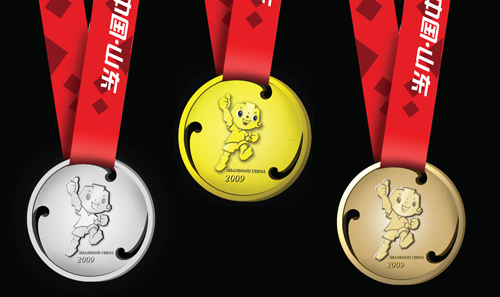 十一運(yùn)會(huì)獎(jiǎng)牌取名“璇寶”。獎(jiǎng)牌圖案設(shè)計(jì)上將山東大汶口文化的典型器物“玉璇璣”和“云紋”巧妙融合在一起。造型設(shè)計(jì)上部分結(jié)構(gòu)采用了鏤空處理,取消了傳統(tǒng)獎(jiǎng)牌中的附加掛環(huán),獎(jiǎng)牌掛帶可以直接穿過鏤空結(jié)構(gòu)進(jìn)行懸掛。獎(jiǎng)牌正面的十一運(yùn)會(huì)會(huì)徽?qǐng)D案中,還鑲嵌了八顆“中國藍(lán)”寶石。專家認(rèn)為,十一運(yùn)會(huì)獎(jiǎng)牌從設(shè)計(jì)理念到獎(jiǎng)牌形態(tài),體現(xiàn)了匠心獨(dú)具的創(chuàng)新特點(diǎn),與會(huì)徽從設(shè)計(jì)概念和視覺形態(tài)上相輔相承、融為一體,整體造型簡(jiǎn)潔、生動(dòng)、現(xiàn)代,充滿了韻律之美。