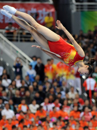 蹦床團體決賽,由單跳與網上兩部分組成,其中每隊一名選手參加單跳,三名選手參加網上;已經連奪九運會和十運會冠軍福建女隊是絕對的奪冠熱門。下午的單跳比賽福建隊派出張媛媛,兩輪分別跳出32.10分和31.60分,確保福建隊在網上比賽之前也位居前列。浙江隊的賈芳芳兩輪單跳分別拿到32.80分和33.60分的高分,單跳后幫助浙江隊暫列第一。