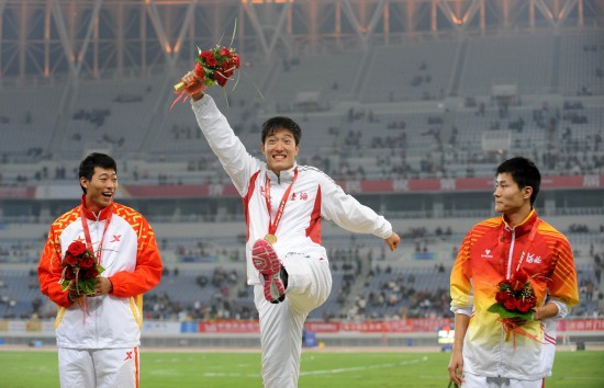 濟南奧體中心,劉翔是當仁不讓的主角。在那長長的110米跑道上他是絕對的王者。在金牌的領獎臺上,他是讓攝影師瘋狂的焦點。在頒獎儀式上,劉翔再次用他充滿創意的動作吸引了所有的目光。
