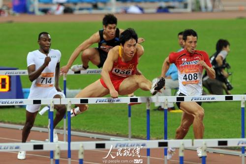 11月22日,在2010亞運會田徑男子110米欄預(yù)賽中,劉翔13秒48小組第一進決賽。(記者翁奇羽 攝影報道)