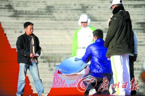 記者在中華世紀壇排練現(xiàn)場看到了廣州亞運游泳冠軍周嘉威和一名新疆殘疾少女