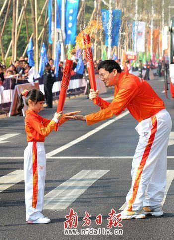 9時50分,張廣寧從火種護(hù)衛(wèi)隊員手中接過“潮流”火炬,從火種盆中點燃。第一棒火炬手符洪芝從張廣寧手中雙手接過火炬,廣州2010年亞洲殘疾人運動會廣州火炬?zhèn)鬟f起跑儀式開始。