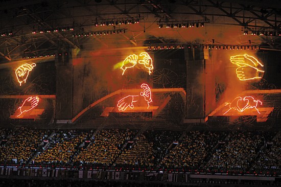 據(jù)了解,開幕式當(dāng)晚,當(dāng)場內(nèi)手語主持人用手語打出“媽媽我愛你”、“朋友我愛你”、“世界我愛你”時(shí),網(wǎng)幕焰火將在夜空中打出“生命”、“陽光”、“關(guān)愛”三組巨型手語圖案。作為首個(gè)手語煙花表演,這個(gè)獨(dú)特的創(chuàng)意來自哪里?黃剛告訴記者:“‘生命陽光,與愛同在’的理念來自胡錦濤總書記提出的‘讓關(guān)愛的陽光照亮每一位殘疾人的心靈’指示精神。說起手語,大家都會(huì)想起殘疾人,但是一般人對(duì)手語并不太了解,我希望這個(gè)煙花能夠激發(fā)人們對(duì)手語的好奇心,去了解手語,并關(guān)注殘疾人,進(jìn)而學(xué)會(huì)關(guān)愛殘疾人。”