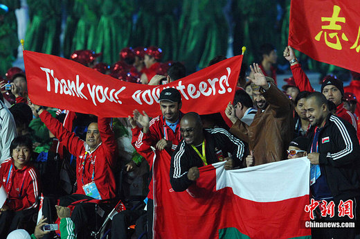 12月19日,廣州亞殘運會亞完美落幕,在廣東奧林匹克體育中心舉行隆重的閉幕式,各國運動員依依不舍向觀眾道別,“再見”廣州亞殘運會。中新社記者 梁永強 攝