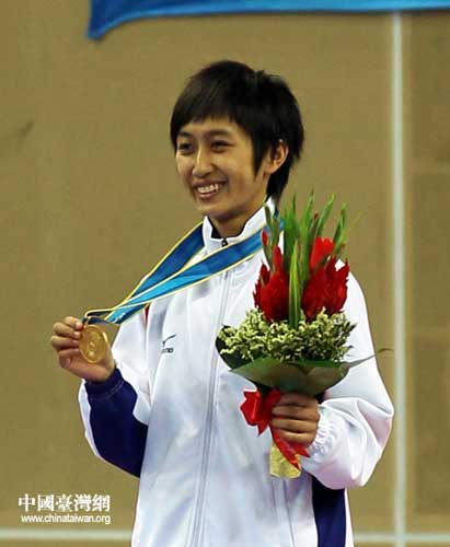 黃顯詠站在最高領獎臺上展示金牌。(中國臺灣網 鐘寶華 攝)