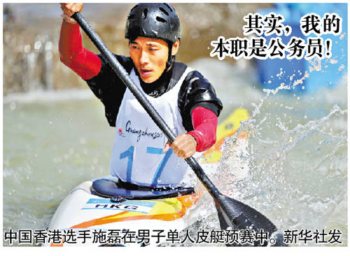 參加激流回旋比賽的施磊是第一次參加亞運會,此前他還參加過3年前的德國皮劃艇回旋世錦賽,最終名列第99名。一直以來,他都是自費訓練和比賽。今年24歲的施磊為了專心備戰,半年前辭掉了香港教育局公務員的穩定工作,中國香港隊終于贊助了他一艘皮艇。