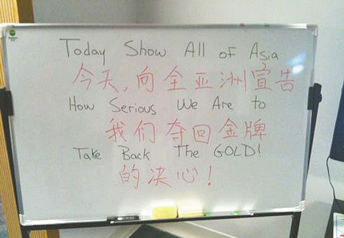 但不久之后,王仕鵬通過微博泄密。老鄧賽前在戰(zhàn)術(shù)白板上寫了一句話:Today show of Asia how serious we are take back we gold。ń裉,向全亞洲宣告我們奪回金牌的決心。