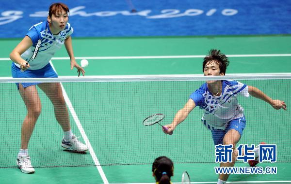 11月21日,韓國選手申白喆/李孝貞(左)在比賽中。當日,在第16屆亞運會羽毛球混合雙打決賽中,韓國選手申白喆/李孝貞以2比0戰勝中國選手張楠/趙蕓蕾,奪得本屆比賽混雙金牌。新華社記者楊宗友攝