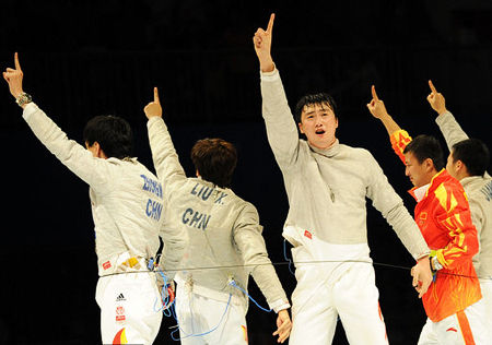 決勝后中國隊(duì)沖上擊劍臺(tái)慶祝