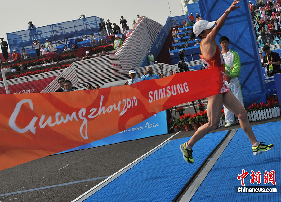 11月27日,中國飛毛腿名將周春秀以2小時25分00秒的賽季最佳成績,奪得廣州亞運會女子馬拉松金牌。另一名中國選手朱曉琳獲得銀牌,朝鮮選手金琴玉得到銅牌。中新社記者 賈國榮 攝