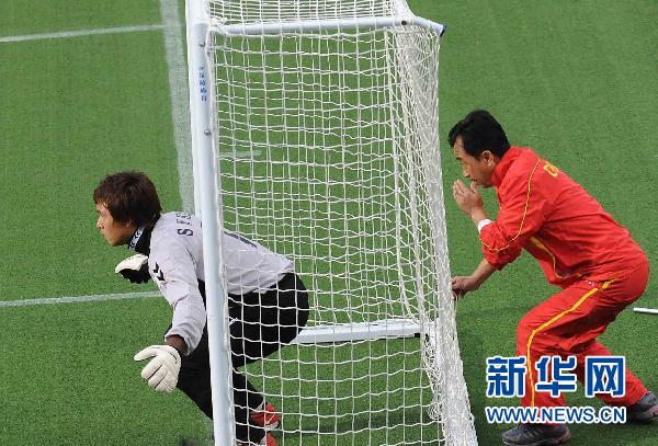 12月14日,中國五人制(盲人)足球隊教練鄒宏謀(右)在對手門后大聲喊叫,為隊員提示進攻方向。提起足球教練,人們都會想到那是一個十分風(fēng)光的角色:要么穩(wěn)坐場邊,鎮(zhèn)定指揮;要么滿場吼叫,放縱個性。但是,在廣州亞殘運會的五人制(盲人)足球比賽場內(nèi),你卻很難找到教練的身影。原來,對陣雙方的教練都“躲在”了對手球門的后面。只見他們時而大喊,時而擊掌,左右跑動,十分忙活。據(jù)介紹,五人制(盲人)足球是根據(jù)盲人視障特點設(shè)計的一項集體球類項目。比賽中,教練站在對手球門的后面,通過發(fā)出各種聲響,幫助球員對來球的方向、速度以及進攻、防守的位置進行判斷,從而迅速做出反應(yīng)。有人曾形象地比喻:“五人制(盲人)足球的教練,就是球員在場上的一雙眼睛”。新華社記者王頌攝