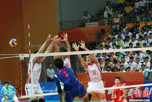 11月14日晚,在2010年廣州亞運會男子排球小組賽第二輪比賽中,中國男排直落三局以3-0零封中華臺北男排,輕松獲得小組賽的兩連勝,三局比分是25-18、25-18和25-21。 中新社記者 鄧霞 攝