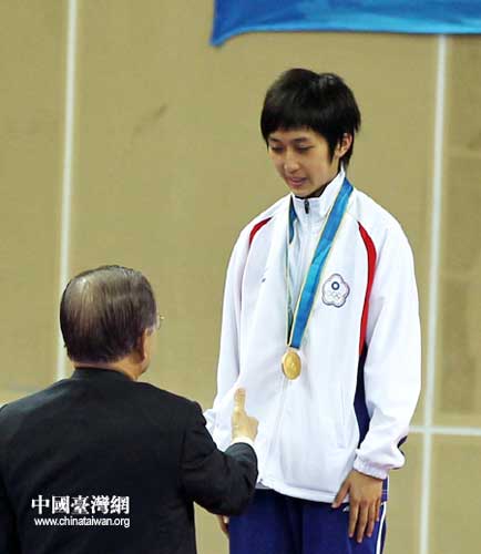 在17日廣州亞運會跆拳道女子46公斤決賽中,中華臺北隊17歲的小將黃顯詠為中華臺北隊再添一金,登上最高領獎臺。圖為頒獎嘉賓向其豎起拇指表示贊賞。(中國臺灣網 鐘寶華 攝)
