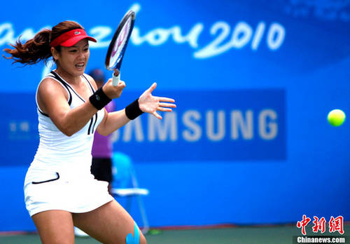 第十六屆廣州亞運會網(wǎng)球雙打決賽11月22日結束,中華臺北選手詹詠然/莊佳容獲得女雙冠軍。圖為詹詠然擊球。 中新社記者 趙振清 攝