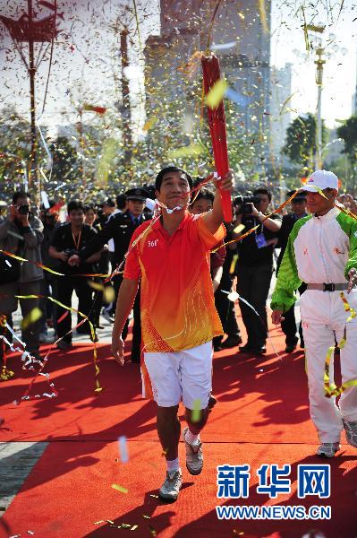 11月8日,第一棒火炬手歐偉庭在飄飛的彩帶中傳遞圣火。當日上午,第16屆亞運會火炬傳遞活動在廣州市荔灣區陳家祠廣場舉行,來自荔灣區的16名火炬手參與了圣火傳遞。 新華社記者 梁旭 攝