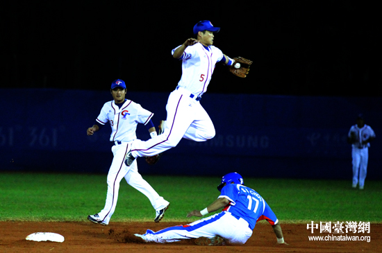 亞運(yùn)棒球決賽,中華臺(tái)北隊(duì)3:9不敵韓國(guó)隊(duì)獲得亞軍。圖為韓國(guó)隊(duì)隊(duì)員上壘被中華臺(tái)北隊(duì)截殺。(中國(guó)臺(tái)灣網(wǎng) 沈鵬 攝)