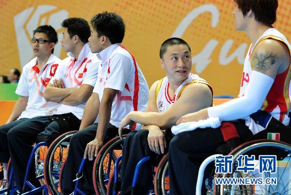 12月14日,在2010年亞殘運會中國對陣阿聯酋的輪椅籃球賽場邊,陳海江(右二)與年輕球員交流。 34歲的陳海江是中國男子輪椅籃球隊最年長的球員。13年前的一場可怕事故讓這位內蒙古小伙腰部以下完全癱瘓,陳海江的人生陷入灰暗。是籃球重新燃起陳海江的希望,6年的輪椅籃球生涯讓陳海江的人生重新“站”了起來!新華社記者劉大偉攝