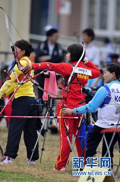 12月13日,中國選手高芳霞(中)在比賽中。當日,在廣州2010年亞殘運會女子個人反曲弓站姿排名賽中,中國選手高芳霞以641環的成績打破世界紀錄。新華社記者陳曄華攝