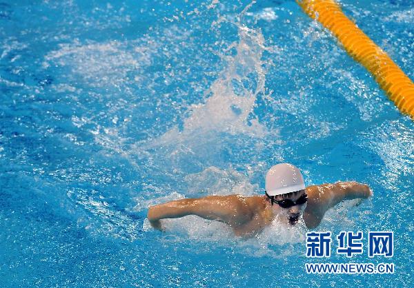 12月13日,中國選手樓陳泉在比賽中。當日上午,在廣州2010亞殘運會游泳比賽男子S11級100米蝶泳決賽中,中國選手樓陳泉以1分07秒04的成績奪得冠軍。新華社記者王頌攝