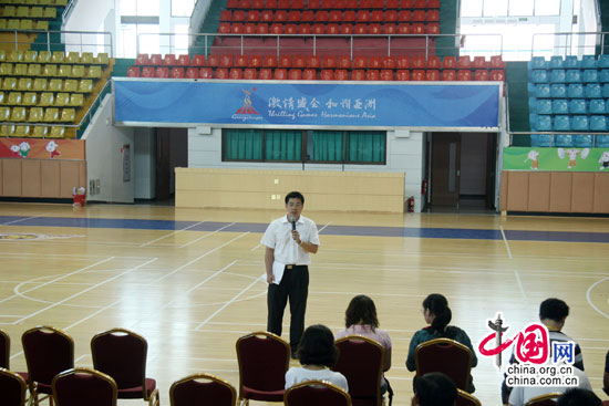 東莞市體育局副局長詹志斌向記者介紹了體育場館的各項情況 攝影 中國網 莊昊