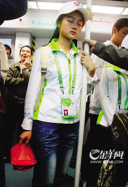 嬌弱身軀,稚嫩面龐,地鐵里站著倚桿睡著了,一臉倦累,手中還拎著個(gè)盒飯。衣服和胸牌顯示了她的身份:廣州亞運(yùn)志愿者。這一幕,被有心人拍了下來(lái),掛上網(wǎng)。她迅速躥紅,并被稱為“最美的‘亞運(yùn)妹妹’”。
