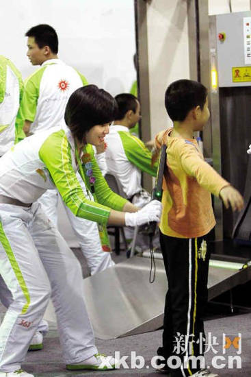 廣州體育館安檢輔助大隊(duì)副大隊(duì)長(zhǎng)、詹婷婷的同學(xué)張?chǎng)握f,安檢原則是男志愿者不檢查女觀眾,女志愿者要檢查男、女觀眾。這樣一來,女志愿者的檢查量更大,像詹婷婷每天至少要下蹲近1000次。