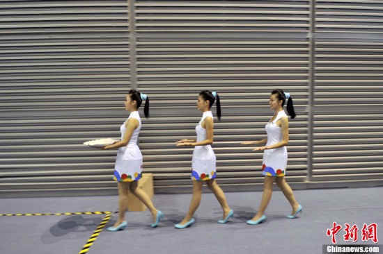 禮儀小姐是深圳大運會頒獎儀式上一道靚麗的風景線。圖為8月13日禮儀小姐們在比賽間隙刻苦訓練。中新社發 金碩 攝