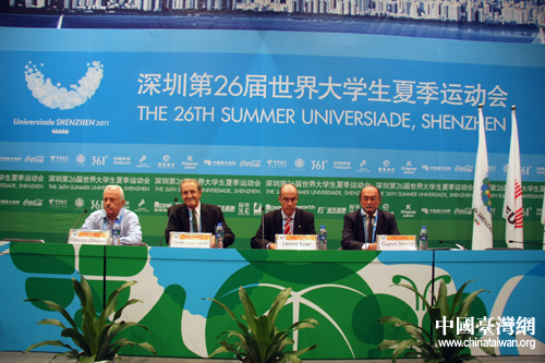 國際大體聯在深圳大運會主媒體中心召開新聞發布會。從左到右分別為:國際技術委員會主席斯塔洛斯·多維斯(左一),新任國際大體聯主席路易·加利安(左二),大體聯國際新聞委員雷諾·埃德(右二),國際體育記者協會主席吉安尼·梅羅(右一)。(中國臺灣網 于斯文 攝)