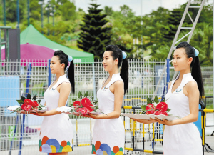 上午11時40分,女子公路自行車120公里個人賽結束后,頒獎儀式在戶外進行。8名準備已久的志愿者正式登場,成為一道靚麗的風景。他們分工明確:一男一女兩名頒獎嘉賓引導員,兩名帥哥負責引導女運動員,身后是3名美麗的“托盤手”。一舉手,一投足,都賞心悅目,贏得觀眾熱烈掌聲。