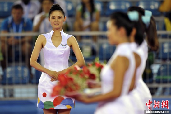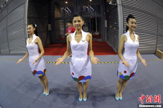 禮儀小姐是深圳大運(yùn)會(huì)頒獎(jiǎng)儀式上一道靚麗的風(fēng)景線。圖為8月13日禮儀小姐們?cè)诒荣愰g隙刻苦訓(xùn)練。中新社發(fā) 金碩 攝