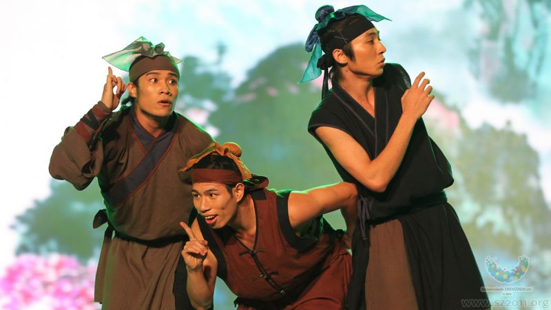 8月15日,第26屆世界大學生運動會運動員村舉辦中國古典舞蹈專場晚會。圖為廣州大學生演出的男子三人舞《山行》。官方圖片社 孔令軍 攝