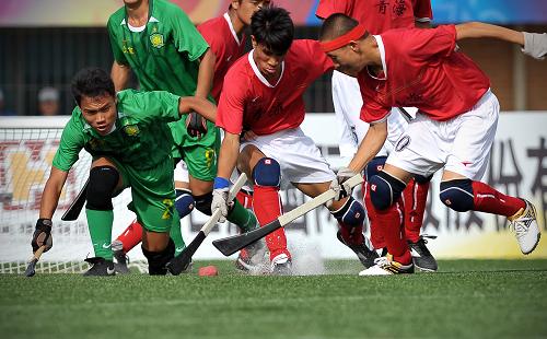 9月12日,青海隊隊員白瑪求培(中)、鋼欽才蛋(右)與北京隊隊員何志文(左)在比賽中拼搶。當日,在第九屆全國少數(shù)民族傳統(tǒng)體育運動會木球第二天的比賽中,青海隊以1比0戰(zhàn)勝北京隊。
