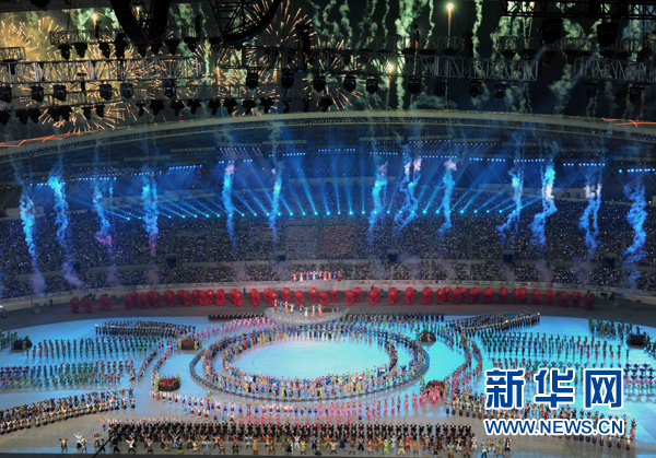 第九屆民族運動會規模空前,凝聚在中華民族的偉大旗幟下,55個少數民族的6773名運動員,在動人心弦的比賽和表演現場,在美好團圓的中秋聯誼的夜晚,在民族大聯歡的絢麗舞臺上,同臺競技,盡展風采,共同譜寫出民族團結新的華章。