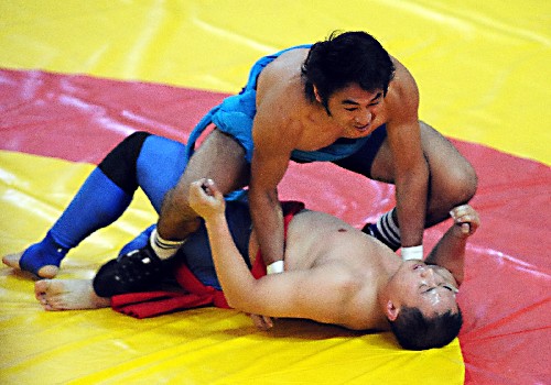 2007年11月14日,西藏選手巴桑羅布(上)在第八屆全國少數民族傳統體育運動會朝鮮族式摔跤87公斤級決賽中,獲得金牌。新華社記者劉廣銘攝