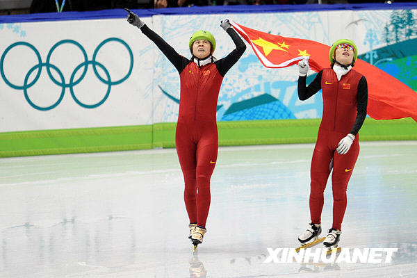2月26日,在溫哥華冬奧會短道速滑女子1000米決賽中,中國選手王濛以1分29秒213的成績奪得冠軍。這是王濛(左)奪冠后與隊友周洋手持國旗慶祝。新華社記者楊磊攝